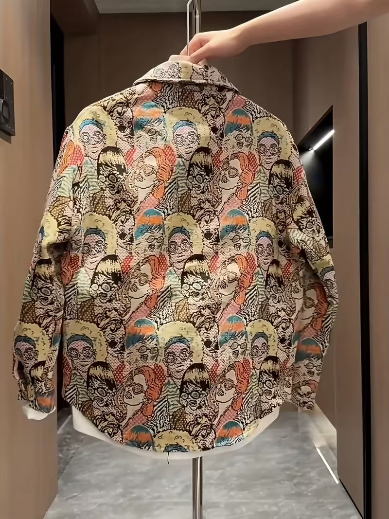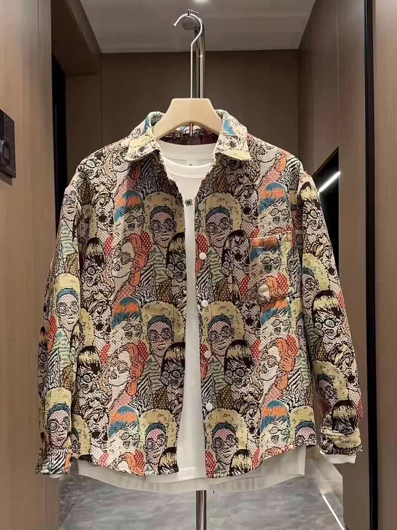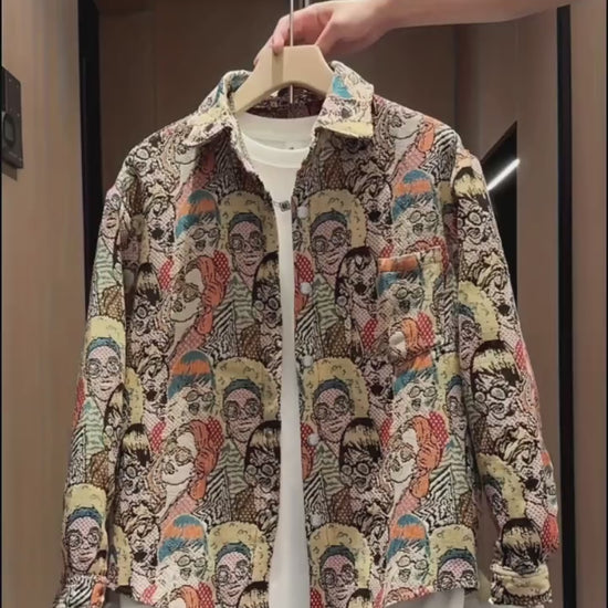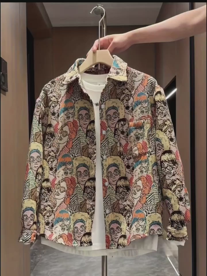 Men's Outdoor Casual Street Style Hip Hop Embroidery Brocade Slimming Long Sleeve Shirt, Cartoon Pattern, Suitable for All Seasons