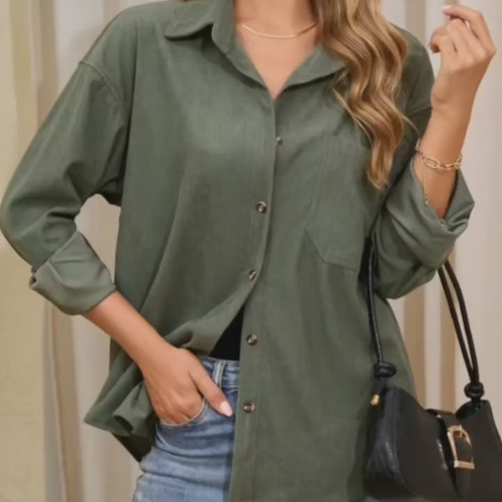 Women'S Casual Corduroy Long Sleeve Shirt with Pockets - 100% Polyester Solid Color Lapel Collar All-Season Woven Blouse